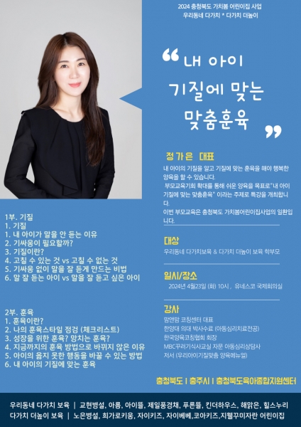 충북형 가치봄 어린이집 사업의 일환으로 추진되는 이날 특강은 ‘우리아이 기질맞춤 양육 매뉴얼’의 저자인 정가은 강사를 초청해 ‘내 아이 기질에 맞는 맞춤 훈육’을 주제로 90분간 진행될 예정이다.
