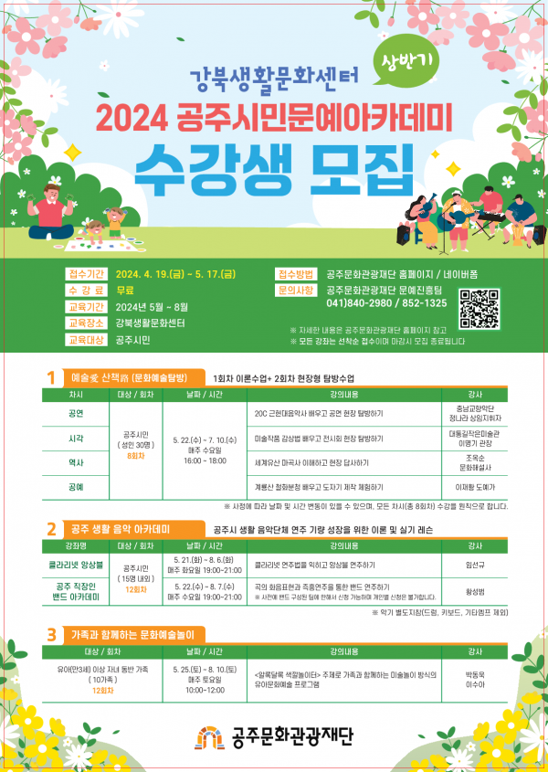 [세종타임즈] 공주문화관광재단은 오는 5월 19일까지 공주시민을 대상으로 강북생활문화센터 시민문예아카데미 상반기 수강생을 모집한다.
