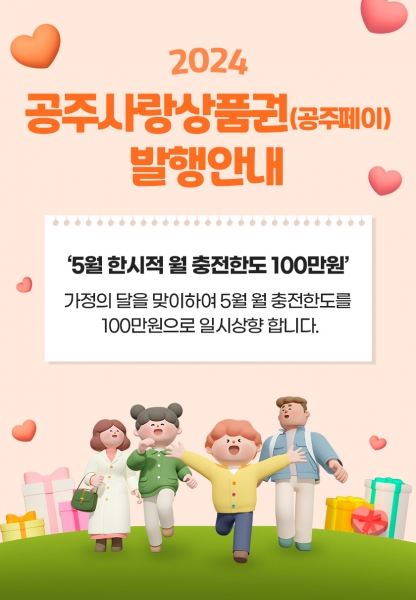 [세종타임즈] 공주시는 가정의 달인 5월을 맞아, 모바일 지역화폐인 공주페이의 월 충전 한도를 100만원으로 일시적으로 상향 조정한다고 26일 발표했다.