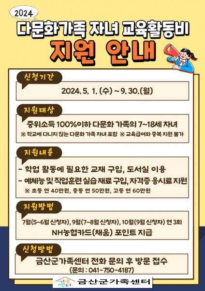 금산군 다문화자녀 교육활동비 지원에 관한 자세한 내용은 금산군가족센터에 문의하면 된다.