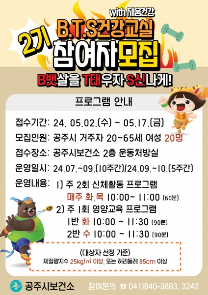 현재 1기가 3월부터 6월까지 운영 중이며, 2기는 7월부터 10월까지 진행될 예정이다. 참여자 모집은 5월 17일까지 선착순으로 진행되며, 대상자는 20세 이상 65세 미만의 공주시 거주 여성으로, 체질량지수(BMI)가 25 이상이거나 허리둘레가 85cm 이상인 자를 우선적으로 선발한다.