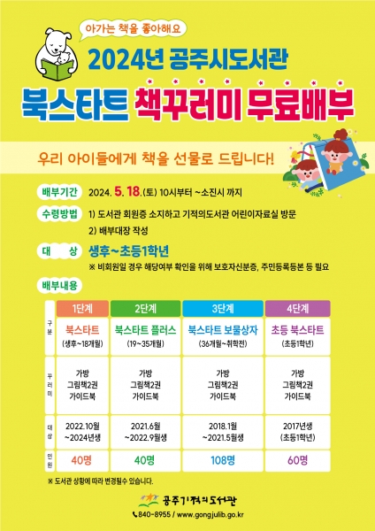 [세종타임즈] 공주기적의도서관이 신생아부터 초등학교 1학년 어린이를 대상으로 하는 '북스타트 책꾸러미'를 배부한다고 밝혔다.
