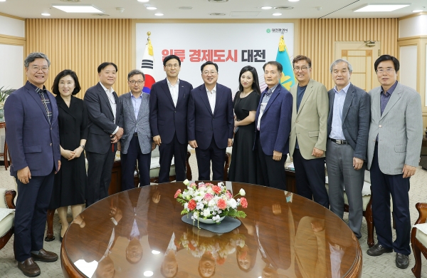 [세종타임즈] 이장우 대전시장은 24일 지역기업에 법률, 노무, 회계 등 전문 분야 무료 상담을 지원하는 ‘대전ICT산업협회 기업지원단’을 만나 격려하고 향후 지역 협력 방안을 논의했다.