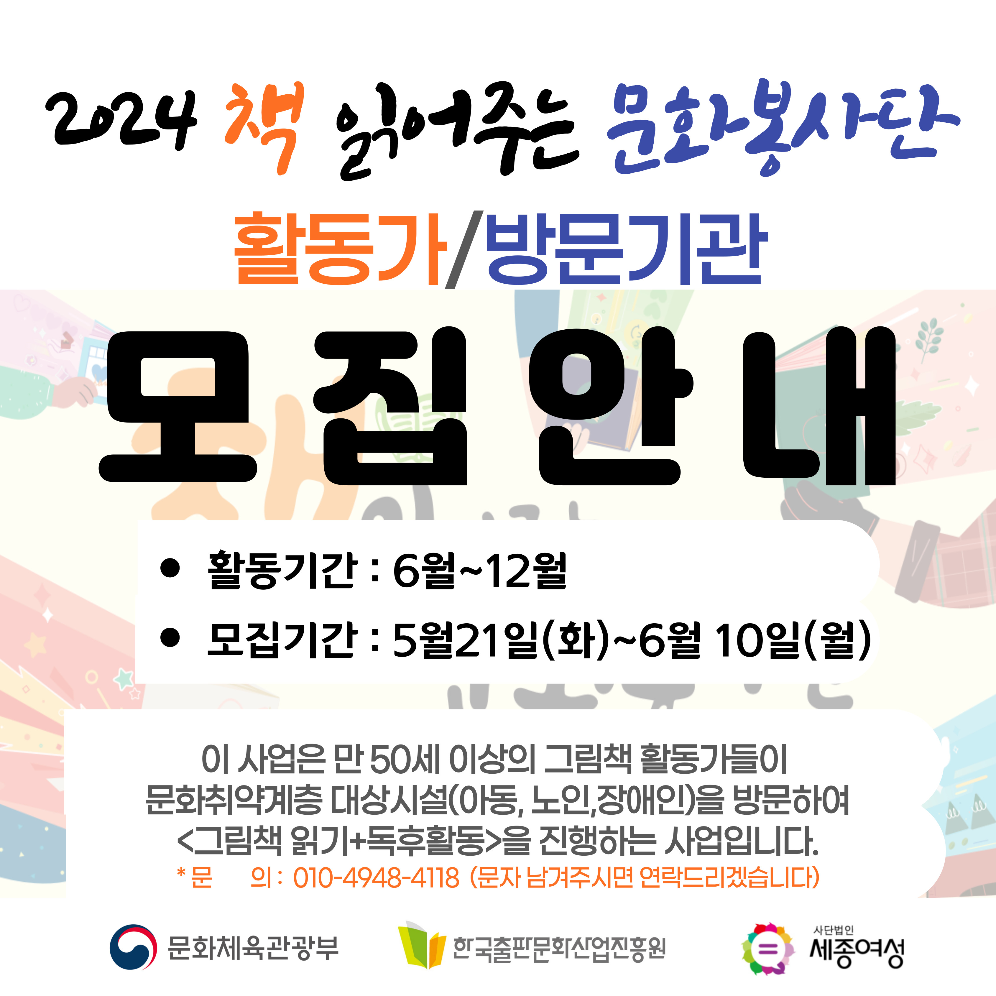 ‘책 읽어주는 문화봉사단’의 활동가와 방문기관의 모집기간은 6월 10일까지로 선발절차를 거친 후 활동가 교육 및 발대식 진행 후 본격적으로 활동을 시작할 예정이다.