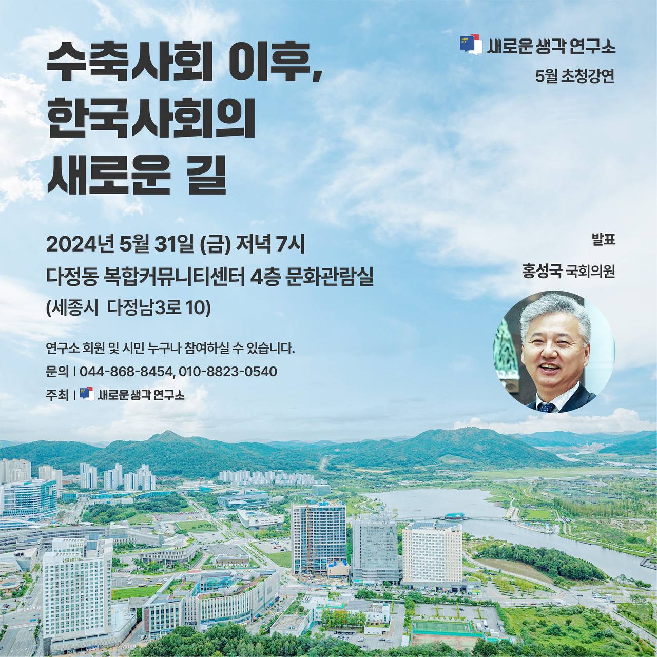 [세종타임즈]새로운 생각 연구소가 5월 31일 금요일 저녁 7시에 세종특별자치시 다정동 복합커뮤니티센터 4층 문화관람실에서 5월 초청강연회를 개최한다. 강연 주제는 “수축사회 이후, 한국사회의 새로운 길”이며 홍성국 국회의원의 강연과 질의응답으로 이어진다.
