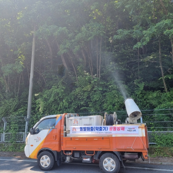 돌발해충 특성상 한 번에 대규모로 방제해야 효과를 극대화할 수 있기에, 공주시 기술보급과와 산림공원과가 협업하여 광역살포기와 방제 요원 6명을 투입해 과수와 산림에 대한 동시 공동방제를 진행했다.