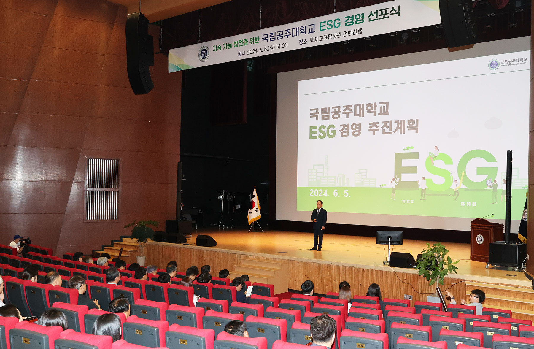 선포식은 국립공주대가 대학경영, 환경, 사회적 책임, 지배구조 등에 맞춰 대학이 나아가야 할 방향으로 학교 경영 활동을 적극 실천하여 지속 가능한 경영체제를 구축할 것을 전 교직원 및 학생들과 공유하고자 마련됐다.