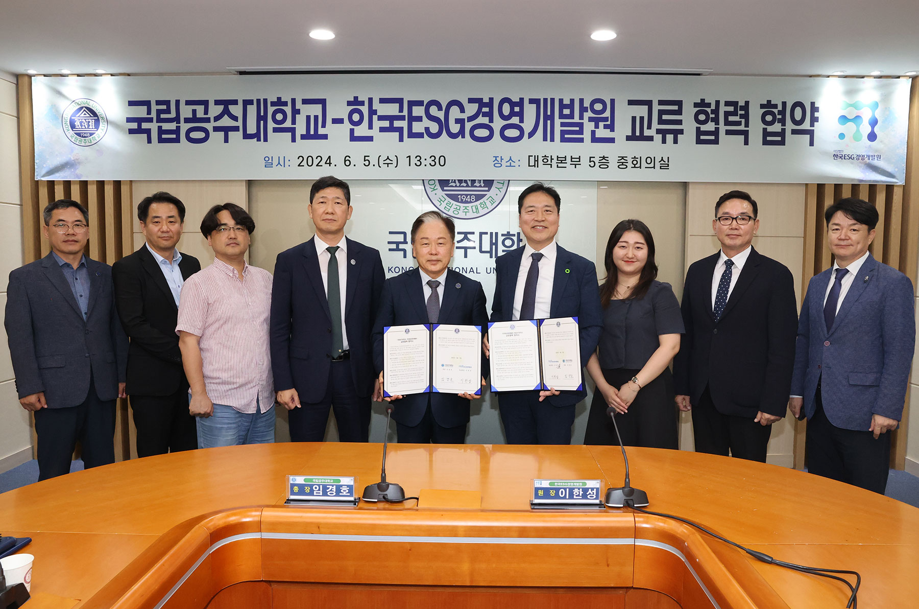 협약식 행사는 국립공주대 임경호 총장과 한국 ESG경영개발원 이한성 대표 원장이 참석한 가운데 체결했다.