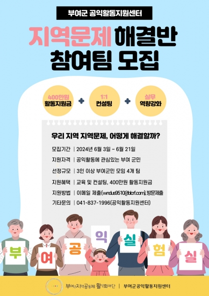 [세종타임즈] 부여군지역공동체활성화재단 공익활동지원센터는 오는 21일까지 2024년 공익실험실 참여공동체를 모집한다.