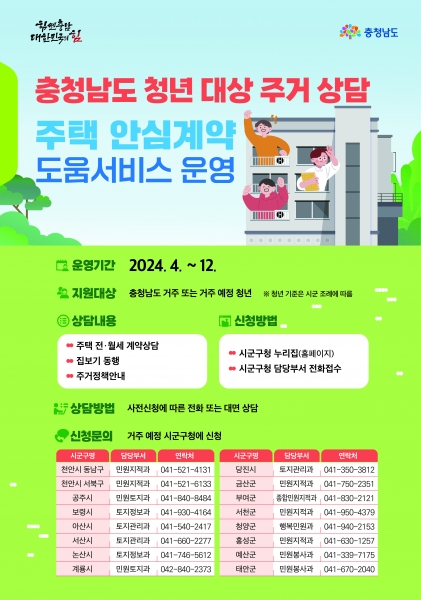 [세종타임즈] 충남도는 전월세 계약 경험이 부족한 도내 청년을 대상으로 연말까지 ‘주택 안심계약 도움서비스’를 본격 시행한다고 10일 밝혔다.