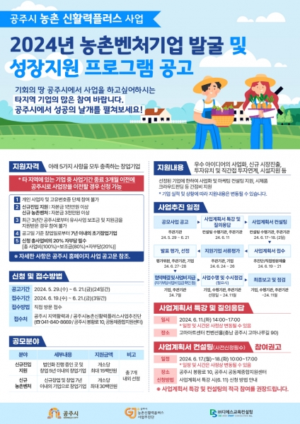 최원철 시장은 “우수한 아이디어를 갖고 있지만 사업화나 신규 시장 진출에 어려움을 겪는 농촌벤처기업이 이번 프로그램에 많이 참여해 주길 바라며, 이를 통해 공주시 농촌에 활력을 불어넣을 수 있기를 기대한다”고 전했다.