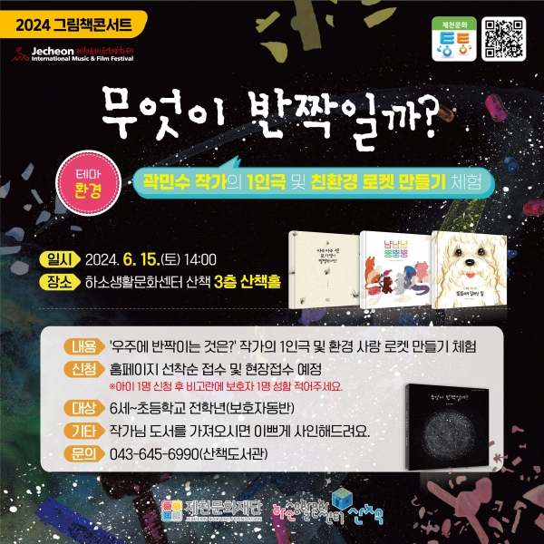 이날 ‘그림책콘서트’는 6월 주제‘환경’에 맞춰 우주 환경 문제를 짚은 ‘무엇이 반짝일까?’ 도서로 곽민수 작가의 1인극 및 환경사랑 로켓만들기 체험이 진행된다.