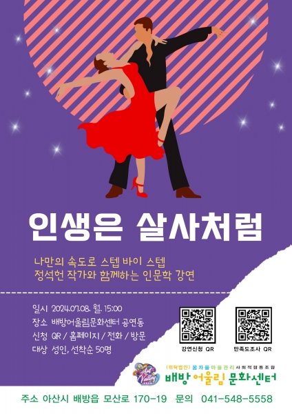 강연은 7월 8일 월요일 오후 3시 배방어울림문화센터 공연장에서 진행되며 참여 신청은 배방어울림문화센터 누리집 또는 전화, 방문으로 가능하다.