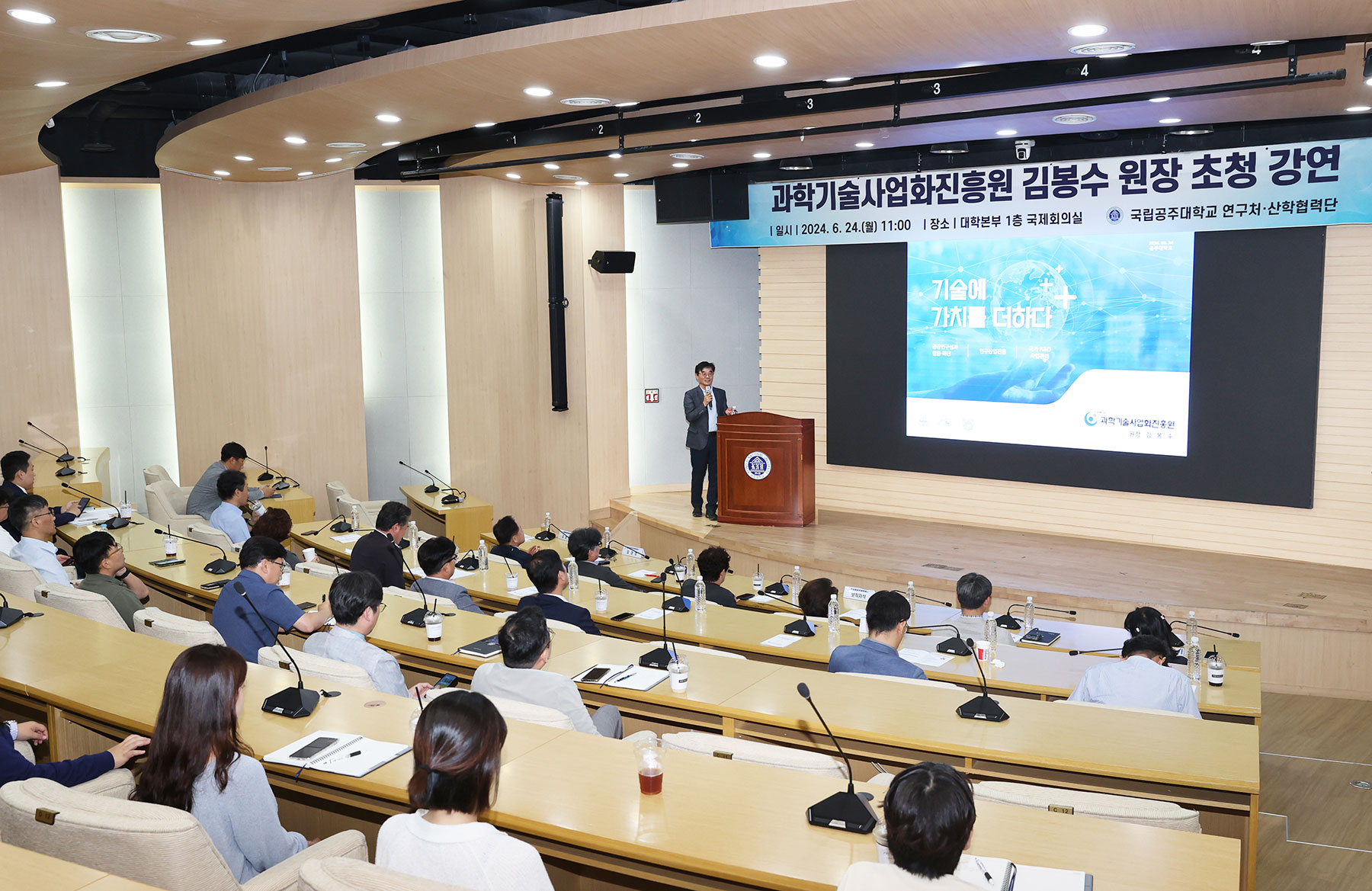 [세종타임즈] 국립공주대학교 연구처·산학협력단(처장․단장 김송자)은 24일 대학본부 1층 국제회의실에서 대학본부 처·국·본부장 등 주요보직자 및 교직원 등을 대상으로 과학기술사업화진흥원 김봉수 원장 초청강연회를 개최했다.