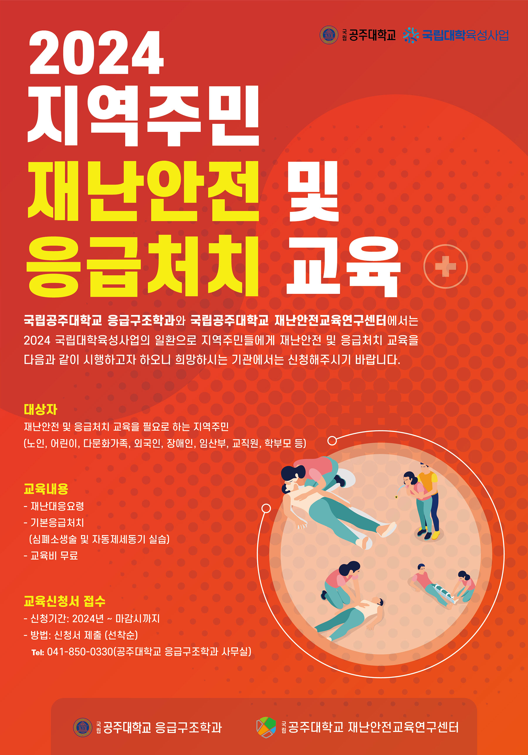 ‘지역주민 재난안전 및 응급처치 교육’신청을 희망하는 경우 (☎041)850-0330(국립공주대학교 응급구조학과 사무실)에 문의하면 된다.