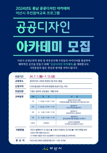 [세종타임즈] 아산시가 충남연구원 공공디자인센터에서 추진하는 ‘충청남도 공공디자인 아카데미’에 선정돼 1일부터 참여자를 모집한다.