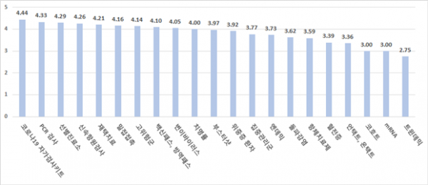 ‘코로나19 자가검사키트’, ‘PCR검사’에 대한 이해도가 높았고 ‘트윈데믹’, ‘mRNA’ 같은 용어는 이해도가 낮게 나타났다.
