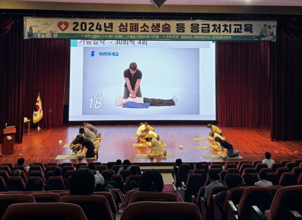 [세종타임즈] 아산시 보건소는 지난 8~9일 이틀간 단국대학교병원과 연계해 아산시청 시민홀과 아산경찰서 강당에서 심폐소생술 등 응급처치 교육을 실시했다.