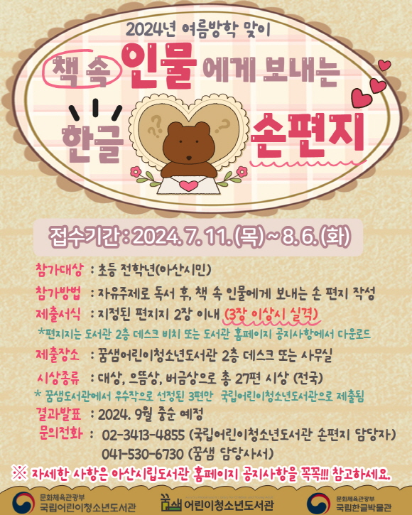 [세종타임즈] 아산시 꿈샘어린이청소년도서관이 ‘국립어린이청소년도서관’에서 진행하는 ‘제10회 책 속 인물에게 보내는 한글 손편지 공모전’에 선정돼 참가작을 모집한다.
