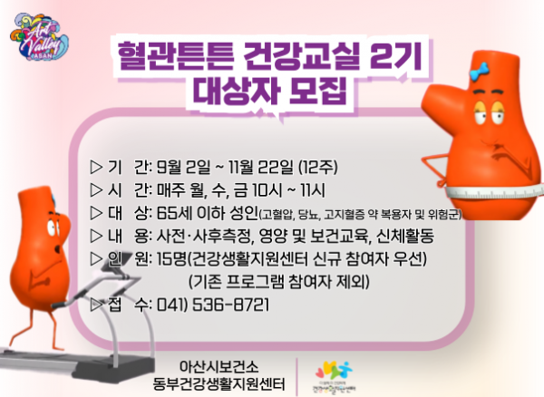 [세종타임즈] 아산시 보건소 동부건강생활지원센터는 심뇌혈관질환 예방을 위해 9월부터 11월까지 총 12주간 주 3회 오전 10시부터 11시까지 ‘혈관튼튼건강교실’을 진행한다.