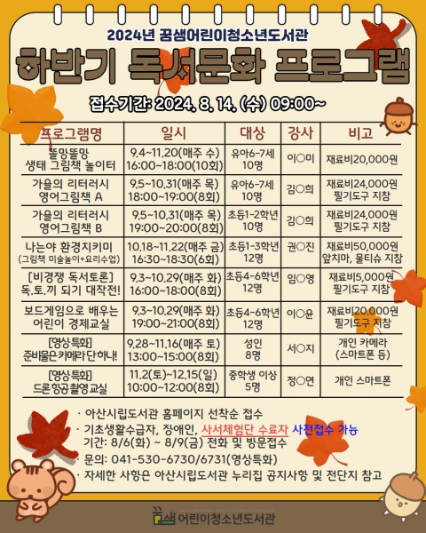 [세종타임즈] 아산시 꿈샘어린이청소년도서관이 2024년 하반기 독서문화 프로그램 수강생을 모집한다.