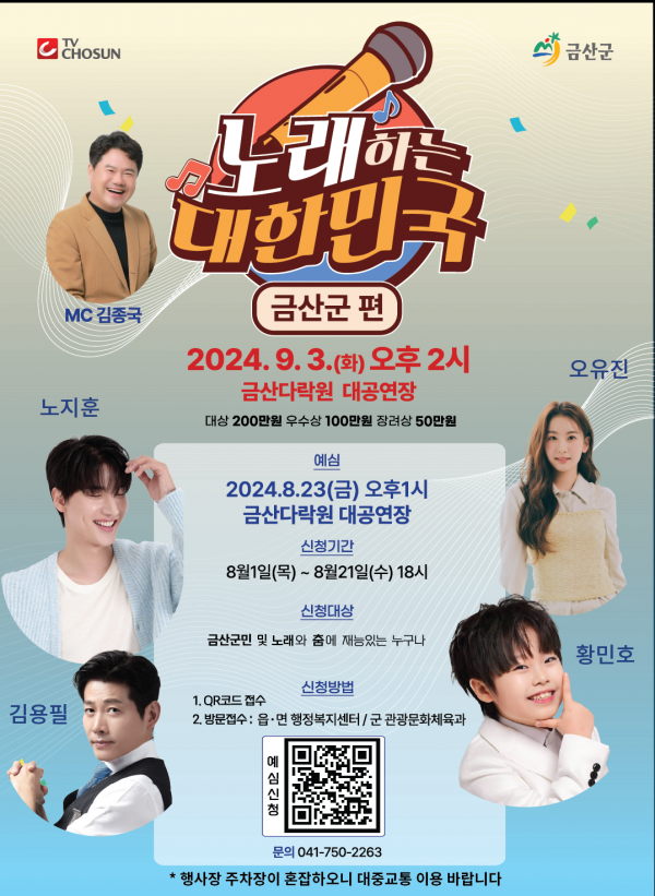 [세종타임즈] 금산군은 오는 21일까지 TV조선 주관 ‘노래하는 대한민국 금산군편’의 예심 참가 신청을 받는다.