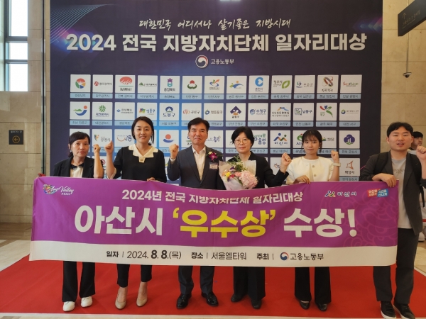 [세종타임즈] 아산시는 8월 8일 고용노동부 주최로 서울 엘타워 그레이스홀에서 개최한 2024년 전국 지방자치단체 일자리대상에서 지역일자리 목표 공시제 부문 ‘우수상’을 수상해 고용노동부 장관상을 받았다.