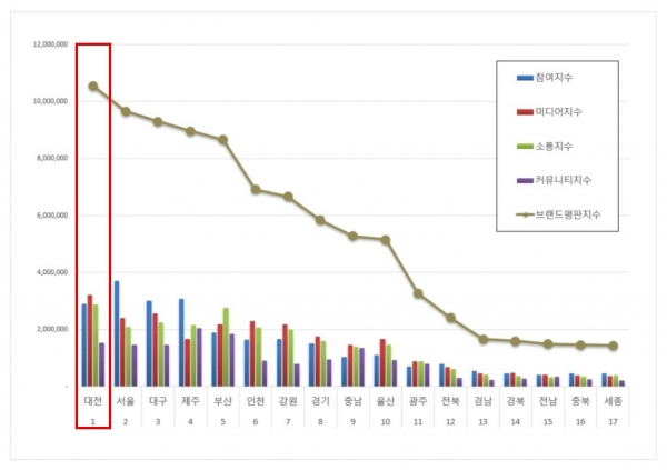 대전시는 참여지수 2,907,887, 미디어지수 3,217,674, 소통지수 2,888,311, 커뮤니티지수 1,535,754를 기록하며, 총 브랜드 평판지수 10,549,626으로 1위에 올랐다.