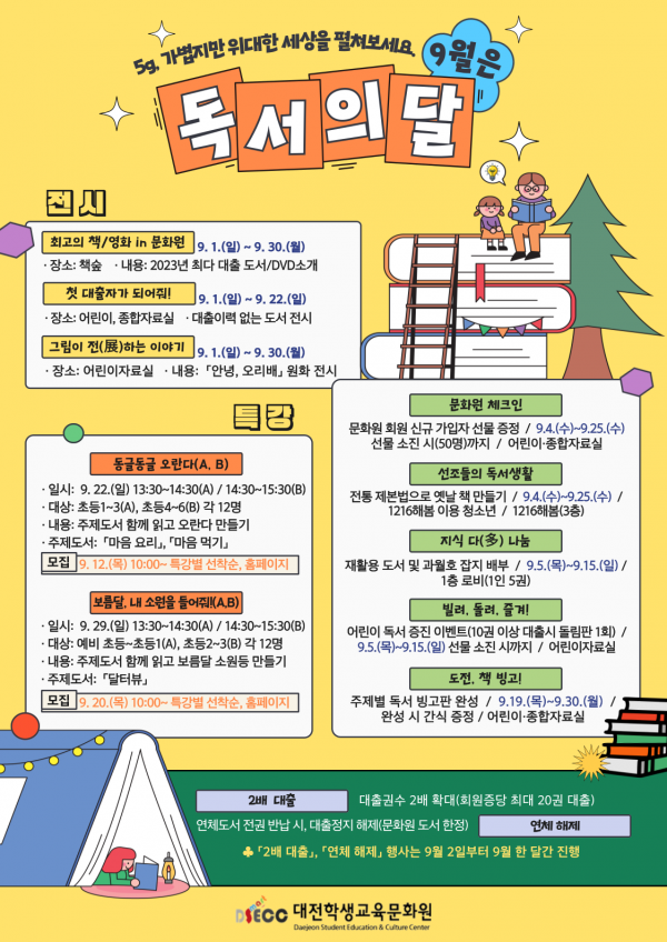 [세종타임즈] 대전학생교육문화원은 9월 독서의 달을 맞아 본원과 산성어린이도서관에서 학생과 지역주민을 대상으로 다양한 독서문화 행사를 개최한다고 밝혔다.