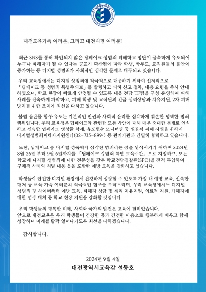 [세종타임즈] 대전시교육청은 9월 4일, 최근 SNS를 통해 확인되지 않은 딥페이크 성범죄 피해학교 명단이 급속히 유포되면서 학생, 학부모, 교직원들의 불안이 커지고 디지털 성범죄에 대한 사회적 우려가 확산됨에 따라, 대응 강화를 위한 서한문을 발표하고 이를 누리집에 게시했다.