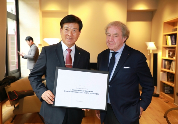 [세종타임즈] 박범인 금산군수는 지난 24일 프랑스 파리 빌모트 사무실에서 프랑스 건축 거장 장 미셀 빌모트와 ‘다락 아트 밸리’ 프로젝트 구상을 위한 대담을 가졌다.