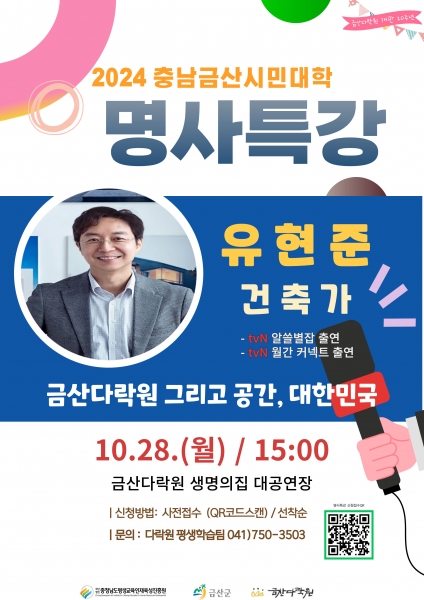 이번 명사 특강에서 유 교수는 20년 동안 금산군을 대표하는 복합문화공간으로 자리 잡은 금산다락원에 대한 이야기와 공간의 주는 의미 및 가치를 담아 ‘금산다락원, 그리고 공간 대한민국’ 이란 주제로 강연을 펼칠 예정이다.