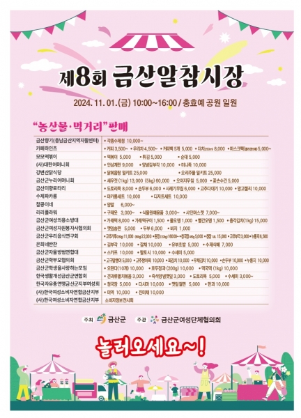 [세종타임즈] 금산군여성단체협의회는 오는 1일 오전 10시부터 오후 4시까지 금산읍 충효예공원에서 제8회 알참시장을 개최한다.