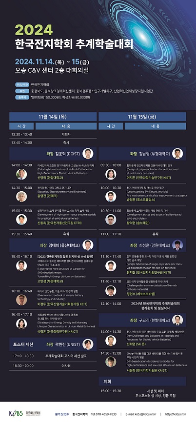 행사는 김동욱 한국전지학회 회장의 개회사와 대전시 이차전지산업 홍보 영상 상영, 한선희 대전시 미래전략산업실장의 환영사로 시작되며, 국내 전문가 13명이 참여하는 초청 강연이 5개 세션으로 진행된다. 학술대회에서는 포스터 발표와 심사가 이루어지며, 대전지역 이차전지 관련 기업의 홍보부스도 함께 운영된다.