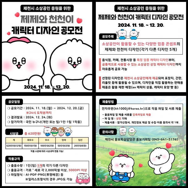 이번 공모전은 다양한 업종별 콘셉트의 제제와 천천이 디자인을 발굴하고 해당 디자인을 제천시 관내 소상공인이 자유롭게 활용 가능하도록 하기 위해 마련됐다.