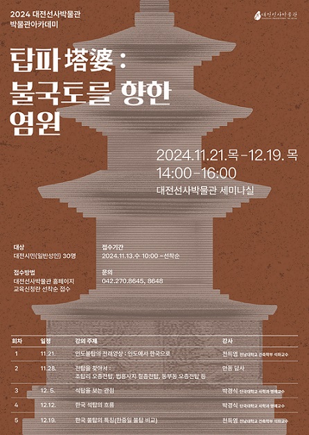 이번 아카데미는 인문학 강좌로, 역사와 문화에 관심 있는 시민 누구나 무료로 참여할 수 있다. 강좌는 11월 21일부터 12월 19일까지 매주 목요일 오후 2시 대전선사박물관에서 열리며, 강의는 인도의 불탑 형식과 아시아로의 전래 양상을 다루는 내용과 우리나라 석탑의 역사와 특징을 깊이 있게 살펴보는 내용으로 구성됐다.