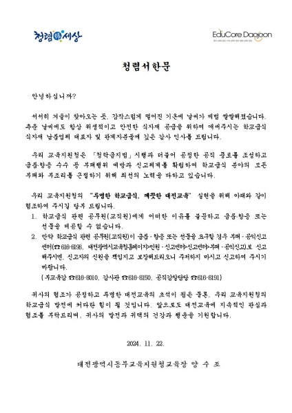 청렴서한문에는 학교급식 관련 공무원에게 금품, 향응, 선물 등을 제공할 수 없다는 내용을 명확히 안내했다. 아울러, 만약 관련 공무원이 이를 요구할 경우 대전교육청 부패·공익신고센터를 통해 신고할 수 있도록 절차와 방법을 상세히 알렸다.