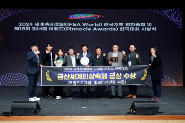 한편 금산세계인삼축제는 지난 9월 미국 펜실베니아주 피츠버그에서 열린 피나클어워드 세계대회에서 금상 2개, 은상 1개, 동상 1개를 수상하며 기조지자체에서 가장 좋은 성적을 거두고 대한민국 종합 3위에 크게 기여했다.