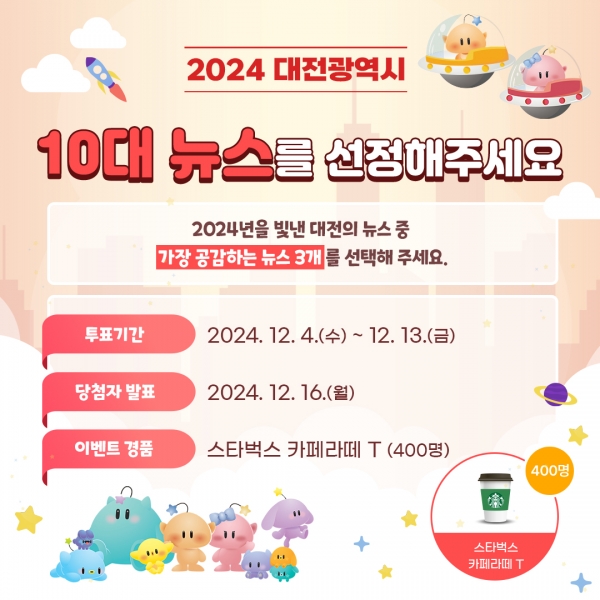 대전시는 시민 참여를 독려하기 위해 경품 이벤트도 준비했다. 투표에 참여한 시민 중 추첨을 통해 400명에게 커피 교환권을 제공할 예정이다.