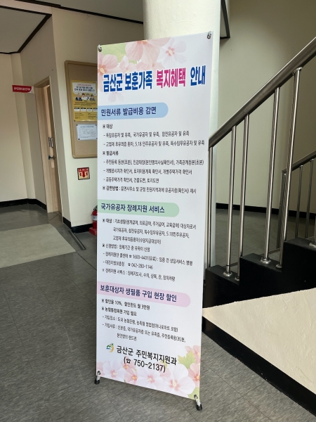 군은 금산읍행정복지센터 및 금산군보훈회관에 보훈가족 복지혜택 안내 배너를 설치하고 국가보훈대상자 생필품 구입 현장할인 안내 문자메시지 발송 등을 진행했다.