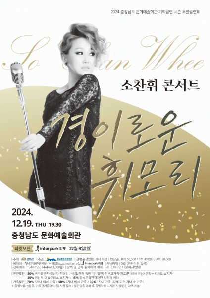 [세종타임즈] 충남문화관광재단은 오는 19일 2024년 충청남도 문화예술회관 기획공연의 마지막 무대로 ‘소찬휘 콘서트 : 경이로운 휘모리’를 선보인다.
