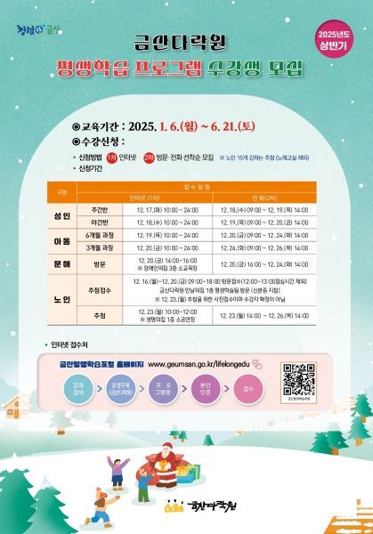 [세종타임즈] 금산다락원은 아동부터 성인, 노인까지 군민 전 계층의 수요를 반영한 2025년 상반기 평생학습 프로그램 수강생을 오는 16일부터 26일까지 모집한다.