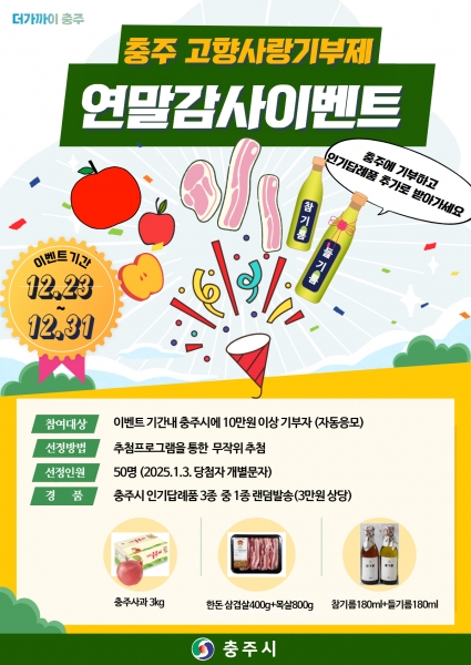 이번 이벤트는 연말을 맞아 충주시를 선택한 기부자에게 감사의 마음을 전하고 충주시 인기 답례품을 알리기 위해 추진된다.