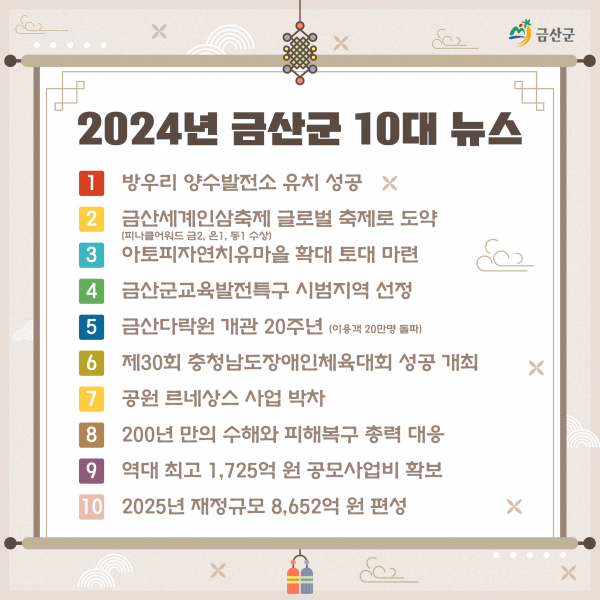 선정된 뉴스를 살펴보면 △방우리 양수발전소 유치 성공 △제42회 금산세계인삼축제 글로벌 축제 도약 △아토피자연치유마을 확대 토대 마련 △금산군교육발전특구 선정 △금산다락원 20주년 △제30회 충남도장애인체육대회 성공 개최 △공원 르네상스 사업 박차 △200년 만의 수해와 피해복구 총력 대응 △역대 최고 1725억원 공모사업비 확보 △2025년 재정규모 8652억원 등이다.