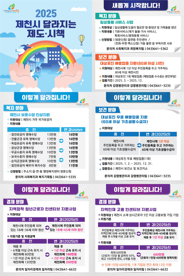 시 관계자는 “2025년 새롭게 시행하거나 달라지는 제천시 시책들이 시민들의 생활과 밀접한 관련이 있는 만큼 관련 사업들을 시민들이 잘 알고 활용할 수 있도록 적극 홍보에 나서겠다”고 밝혔다.