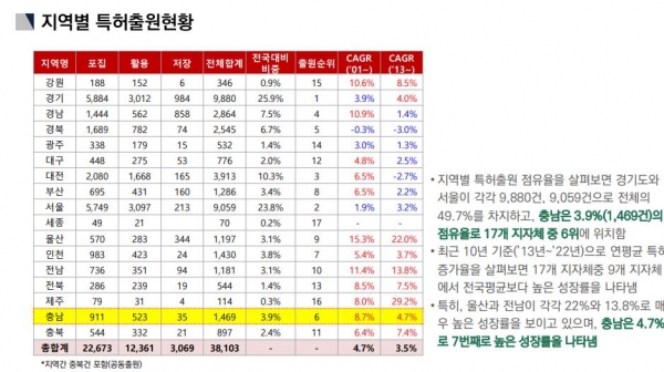특허출원 동향 분석 결과 충남은 전국 대비 약 2배인 8.7%의 높은 연평균성장률을 나타냈으며 주요 출원인으로는 현대제철, 한국서부발전, 한화토탈에너지스 등 제철, 발전, 석유화학 등의 업종이 주를 이루었다.
