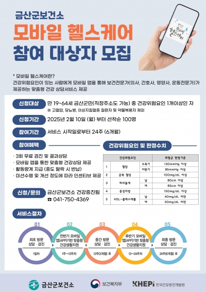 [세종타임즈] 금산군보건소는 10일부터 21일까지 모바일 헬스케어 상반기 대상자 100명을 선착순 모집한다.