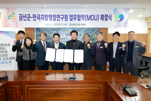 [세종타임즈] 금산군과 한국지방행정연구원은 지난 26일 금산군청에서 박범인 금산군수, 육동일 한국지방행정연구원장을 비롯한 임직원들이 참석한 가운데 업무협약을 체결했다.