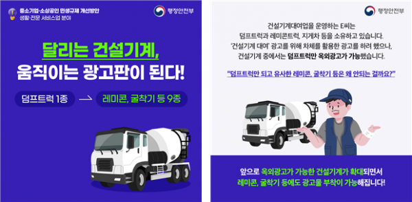 [세종타임즈] 행정안전부는 자기광고가 가능한 건설기계와 전광판 사용이 가능한 자동차의 범위를 확대하는 내용의 ‘옥외광고물 등의 관리와 옥외광고산업 진흥에 관한 법률 시행령’ 일부 개정령안을 4월 30일부터 입법예고 한다고 밝혔다.