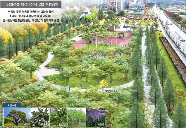 방서수변공원에는 ‘디딤·확산숲’ 이 1.9ha에 조성되며 4월 말 공사에 돌입해 8월 말 준공을 목표로 진행 중이다.